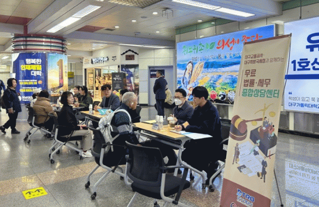 [NWS¹æ¼Û=Çѽ¸ñ ±âÀÚ]´ë±¸±³Åë°ø»ç´Â 3¿ù 31ÀÏ ¹Ý¿ù´ç¿ª ȯ½Â Åë·Î¿¡¼­ ´ë±¸Áö¹æ±¹¼¼Ã»°ú ÇÔ²² ½Ã¹ÎµéÀ» À§ÇÑ ¹ý·ü¡¤¼¼¹«¡¤³ë¹« °ü·Ã ¹«·á Á¾ÇÕ»ó´ã¼¾Å͸¦ ¿î¿µÇß´Ù. »ó´ãÀº °ü·Ã ºÐ¾ß Àü¹®°¡µé(º¯È£»ç 1¸í, ³ë¹«»ç 1¸í, ³³¼¼ º¸È£°ü 2¡¦