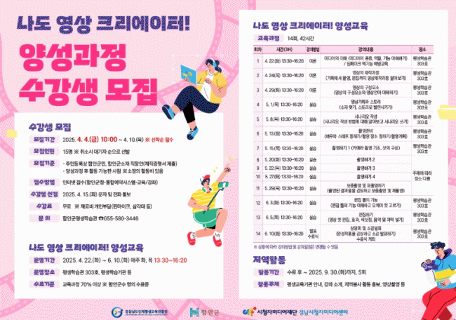 [NWS¹æ¼Û=Çѽ¸ñ ±âÀÚ] ÇԾȱºÀº Æò»ýÇнÀ ºÐ¾ß ¿µ»óȰµ¿°¡¸¦ ¾ç¼ºÇÏ´Â ¡®³ªµµ ¿µ»ó Å©¸®¿¡ÀÌÅÍ¡¯ ¾ç¼º°úÁ¤ ¼ö°­»ýÀ» ¿À´Â 4ÀÏ ¿ÀÀü 10½ÃºÎÅÍ 10ÀϱîÁö ¼±Âø¼øÀ¸·Î ¸ðÁýÇÑ´Ù. À̹ø °úÁ¤Àº ¿µ»ó ÄÜÅÙÃ÷ ±âȹ, ½ºÅ丮 ±¸¼º, ÃÔ¿µ, ÆíÁý µî¡¦
