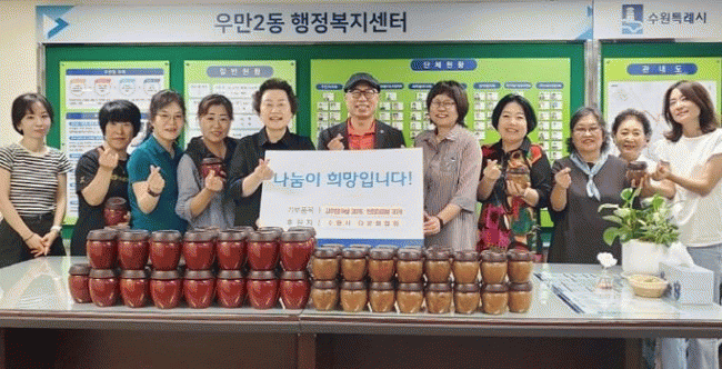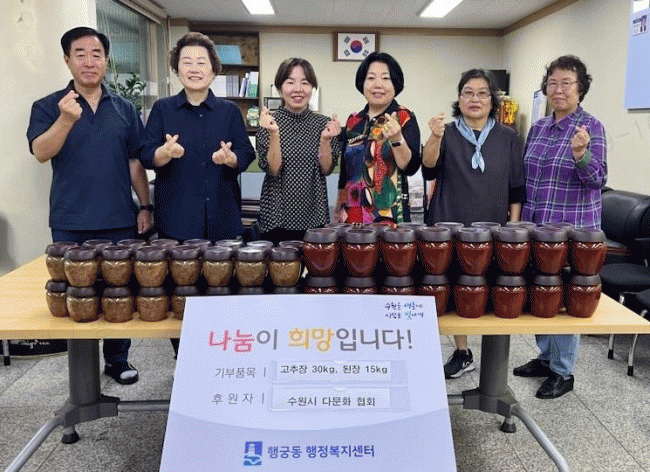 [NWS¹æ¼Û=Çѽ¸ñ ±âÀÚ]Áö³­ 9¿ù 16ÀÏ, ¼ö¿ø½Ã ´Ù¹®È­Çùȸ´Â ¿ì¸¸2µ¿ ÇàÁ¤º¹Áö¼¾ÅÍ¿¡¼­ ¡®ÀüÅëÀå·ù ÀÌ¿ôµ½±â Àü´Þ½Ä¡¯À» ÁøÇàÇϸç, °íÃßÀå 30°³(1kg)¿Í µÈÀå 30°³(500g)¸¦ ¼ö¿ø½Ã ÆÈ´Þ±¸ ¿ì¸¸2µ¿¿¡ Àü´ÞÇß´Ù. À̹ø ±âºÎ´Â Áö¿ª»çȸÀÇ ¾î·Á¡¦
