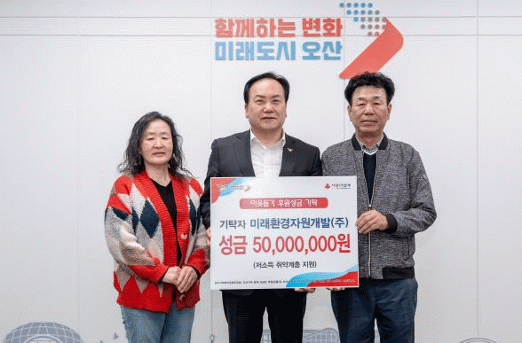 [NWS¹æ¼Û=Çѽ¸ñ ±âÀÚ]¿À»ê½Ã´Â Áö³­ 1ÀÏ ¹Ì·¡È¯°æÀÚ¿ø°³¹ß(ÁÖ)À¸·ÎºÎÅÍ Áö¿ª ³» Àú¼ÒµæÃþÀ» À§ÇÑ ¼º±Ý 5õ¸¸ ¿øÀ» ±âŹ¹Þ¾Ò´Ù°í ¹àÇû´Ù. ±âŹµÈ ¼º±ÝÀº °ü³» Ãë¾à°èÃþÀ» À§ÇÑ º¹Áö »ç¾÷¿¡ »ç¿ëµÉ ¿¹Á¤À̸ç, ¹Ì·¡È¯°æÀÚ¿ø°³¹ß(ÁÖ)Àº À̹ø¡¦