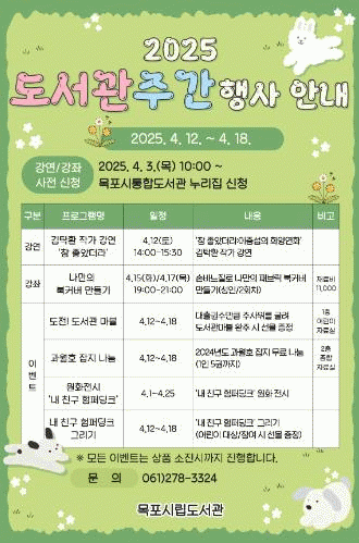 [»çȸ] ¸ñÆ÷½Ã¸³µµ¼­°ü, 4¿ù µµ¼­°ü ÁÖ°£ µ¶¼­¹®È­ Çà»ç ¿î¿µ |2025. 04.02