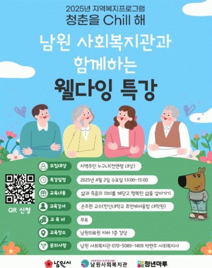 [NWS¹æ¼Û=Çѽ¸ñ ±âÀÚ]³²¿ø»çȸº¹Áö°üÀº 4¿ù 2ÀÏ ¼ö¿äÀÏ 13½ÃºÎÅÍ ³²¿øÀÇ·á¿ø ÁöÇÏ 1Ãþ °­´ç¿¡¼­ »î°ú Á×À½ÀÇ Àǹ̸¦ ±ú´Ý°í ÇູÇÑ »îÀ» »ì¾Æ°¡±â¶ó´Â ÁÖÁ¦·Î À£´ÙÀ× Æ¯°­À» ÇÑ´Ù°í ¹àÇû´Ù. À£´ÙÀ× À̶õ? Àΰ£ÀǷμ­ Á¸¾ö¼º°ú °¡Ä¡, ǰ¡¦