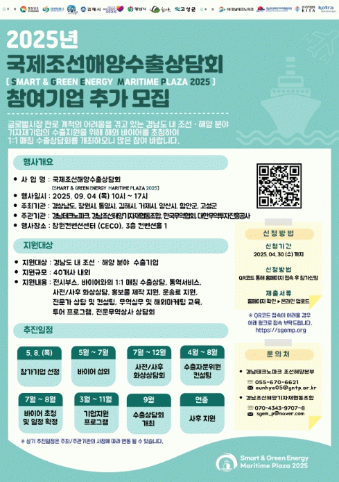 [NWS¹æ¼Û=ÇãÀº¼­ ±âÀÚ]°æ»ó³²µµ´Â ½Å±Ô Âü°¡±â¾÷ ¸ðÁý È®´ë µî ÃæºÐÇÑ ¾È³»¿Í Âü¿© µ¶·Á¸¦ À§ÇØ ¡®2025 ±¹Á¦Á¶¼±Çؾç¼öÃâ»ó´ãȸ¡¯¿¡ Âü°¡ÇÒ ±â¾÷À» Ãß°¡ ¸ðÁýÇÑ´Ù. ¼öÃâ»ó´ãȸ¿¡ Âü°¡¸¦ ¿øÇÏ´Â ±â¾÷Àº 4¿ù 2ÀϺÎÅÍ 30ÀϱîÁö »ó´ãȸ °ø½Ä¡¦