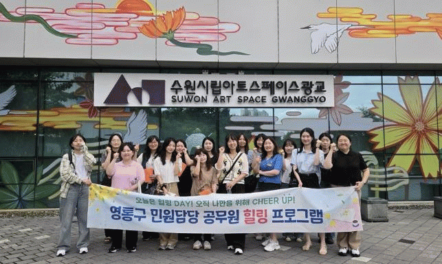 [NWS¹æ¼Û=Çѽ¸ñ ±âÀÚ]¼ö¿ø½Ã ¿µÅ뱸´Â Áö³­ 16ÀÏ, ¼ö¿ø½Ã¸³¾ÆÆ®½ºÆäÀ̽º±¤±³¿¡¼­ ¿µÅ뱸 ¹Î¿ø´ã´ç °ø¹«¿øÀ» ´ë»óÀ¸·Î -¿À´ÃÀº Èú¸µ DAY! ³ª¸¦ À§ÇØ Cheer up!- ¿µÅ뱸 ¹Î¿ø´ã´ç °ø¹«¿ø ¸¶À½Ä¡À¯¸¦ À§ÇÑ Èú¸µ ÇÁ·Î±×·¥À» ÁøÇàÇß´Ù. À̹ø ¡¦
