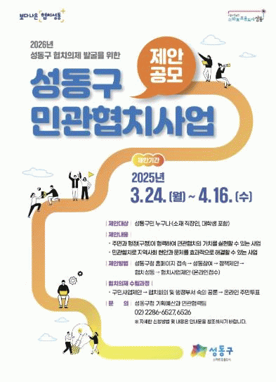 [NWS¹æ¼Û=Çѽ¸ñ ±âÀÚ]¼­¿ï ¼ºµ¿±¸´Â 3¿ù 24ÀϺÎÅÍ 4¿ù 16ÀϱîÁö '2026³âµµ ¼ºµ¿±¸ ÇùÄ¡ÀÇÁ¦ ¿Â¶óÀÎ Á¦¾È °ø¸ð'¸¦ ÁøÇàÇÑ´Ù°í ¹àÇû´Ù. À̹ø °ø¸ð´Â ¹Î°üÀÌ Çù·ÂÇØ Áö¿ª»çȸÀÇ ¹®Á¦¸¦ ÇØ°áÇÏ°í º¯È­¸¦ À̲ø¾î³¾ ÀÇÁ¦ ¹ß±¼À» À§ÇÑ °ÍÀ¸·Î,¡¦