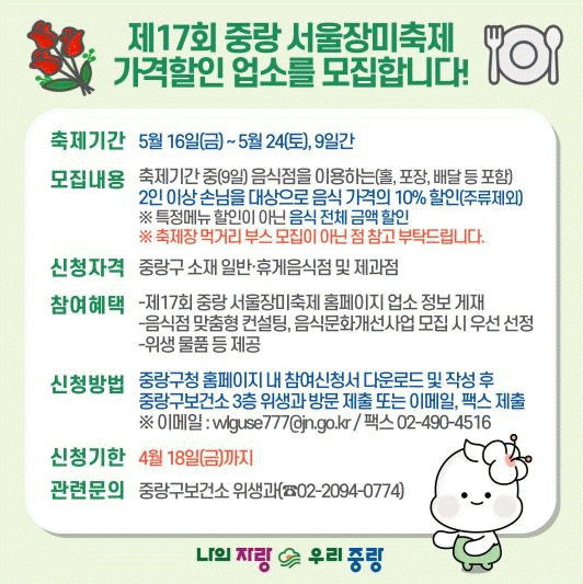 [NWS¹æ¼Û=Çѽ¸ñ ±âÀÚ]Áß¶û±¸°¡ Áß¶û ¼­¿ïÀå¹ÌÃàÁ¦¸¦ ÇÔ²²ÇÒ ¡®Àå¹ÌÃàÁ¦ °¡°ÝÇÒÀξ÷¼Ò¡¯¸¦ ¸ðÁýÇÑ´Ù. ¿ÃÇØ Áß¶û ¼­¿ïÀå¹ÌÃàÁ¦´Â 5¿ù 16ÀϺÎÅÍ 24ÀϱîÁö 9Àϰ£ °³ÃֵȴÙ. ±¸´Â ÃàÁ¦ ±â°£ ¡®Àå¹ÌÃàÁ¦ °¡°ÝÇÒÀξ÷¼Ò¡¯¸¦ ¿î¿µÇÏ¿© ¹æ¹®°´µé¿¡¡¦