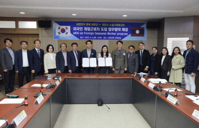 [NWS¹æ¼Û=Çѽ¸ñ ±âÀÚ]º¸Àº±ºÀº 1ÀÏ ±ºÃ» ¼ÒȸÀǽǿ¡¼­ ¿Ü±¹ÀÎ °èÀý±Ù·ÎÀÚ µµÀÔÀ» ÅëÇÑ ³óÃÌ Àη³­ ÇØ¼Ò¸¦ À§ÇØ º¸Àº±ºÃ» ¼ÒȸÀǽǿ¡¼­ ¶ó¿À½º¿Í ¾÷¹«Çù¾à(MOU)À» ü°áÇß´Ù°í ¹àÇû´Ù. À̹ø Çù¾à½ÄÀ» À§ÇØ ¶ó¿À½º ³ëµ¿»çȸº¹ÁöºÎ ¾Æ´©¼±¡¦