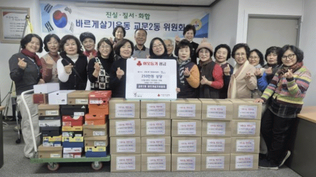 [NWS¹æ¼Û=Çѽ¸ñ ±âÀÚ]±¸¸®½Ã ±³¹®2µ¿¹Ù¸£°Ô»ì±âÀ§¿øÈ¸´Â Áö³­ 9ÀÏ ¿¬¸»À» ¸Â¾Æ Áö¿ª»çȸ¿¡ ¿ÂÁ¤À» ÀüÇϰíÀÚ ÃÑ 250¸¸¿ø »ó´çÀÇ ÀÌ¿ôµ½±â ¹°Ç°À» ÈÄ¿øÇß´Ù. À̹ø ÈÄ¿ø ¹°Ç°Àº »ý°è¿¡ ½ÇÁúÀûÀÎ µµ¿òÀÌ µÇ´Â ½Ä·áǰ ŰƮ 20¹Ú½º¿Í 10¸¸¿ø±Ç¡¦
