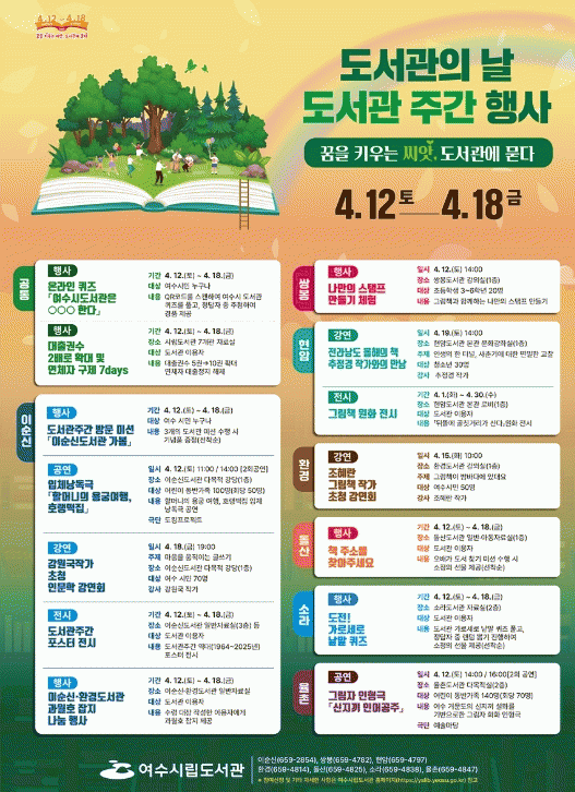 [NWS¹æ¼Û=Çѽ¸ñ ±âÀÚ]¿©¼ö½Ã°¡ µµ¼­°üÀÇ ³¯(4¿ù 12ÀÏ)À» ±â³äÇØ ¿À´Â 12ÀϺÎÅÍ 18ÀϱîÁö µµ¼­°ü ÁÖ°£ Çà»ç¸¦ ¿î¿µÇÑ´Ù. À̹ø Çà»ç´Â ¡®²ÞÀ» Ű¿ì´Â ¾¾¾Ñ, µµ¼­°ü¿¡ ¹¯´Ù¡¯¸¦ ÁÖÁ¦·Î 7°³ µµ¼­°ü(À̼ø½Å¡¤½ÖºÀ¡¤Çö¾Ï¡¤È¯°æ¡¤µ¹»ê¡¤¼Ò¶ó¡¤¡¦