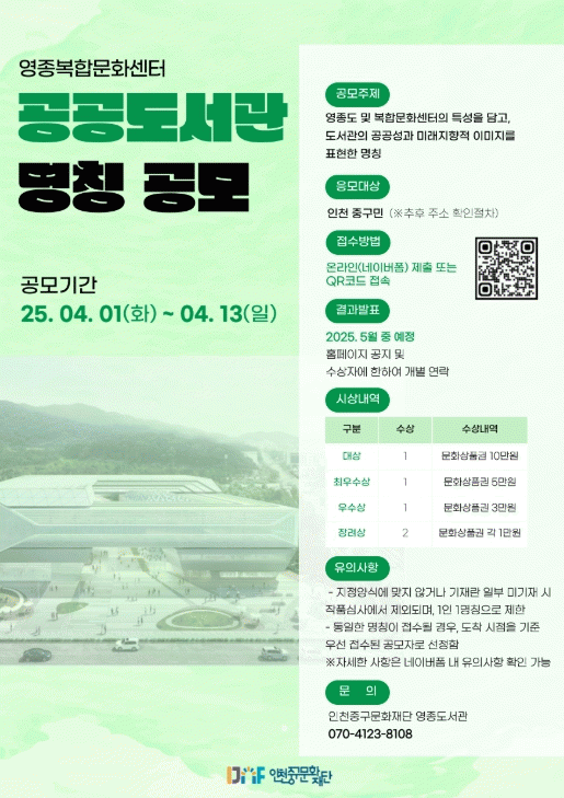 [NWS¹æ¼Û=Çѽ¸ñ ±âÀÚ] (Àç)ÀÎõÁß±¸¹®È­Àç´ÜÀº ¿ÃÇØ °³°üÀ» ¾ÕµÐ ¿µÁ¾º¹ÇÕ¹®È­¼¾ÅÍ ³» °ø°øµµ¼­°üÀÇ °ø½Ä ¸íĪ ¼±Á¤À» À§ÇØ Áß±¸ ±¸¹ÎÀ» ´ë»óÀ¸·Î ¸íĪ °ø¸ð¸¦ ÁøÇàÇÑ´Ù°í 1ÀÏ ¹àÇû´Ù. À̹ø ¸íĪ °ø¸ð´Â µµ¼­°üÀÌ º¹ÇÕ¹®È­°ø°£À¸·Î¼­ ¡¦
