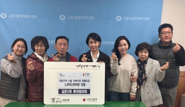 [NWS¹æ¼Û=Çѽ¸ñ ±âÀÚ]±¸¸®½Ã ±³¹®2µ¿ÅëÀåÇùÀÇȸ´Â Áö³­ 31ÀÏ ´ëÇü »êºÒ·Î ÇÇÇØ¸¦ ÀÔÀº ¿µ³² Áö¿ª ÁֹεéÀ» µ½±â À§ÇØ ¼º±Ý 100¸¸¿ø(ÅëÀåÇùÀÇȸ 50¸¸¿ø, ºÎȸÀå ¹èÀå¼÷ 50¸¸¿ø)À» Àü´ÞÇß´Ù. Àü´ÞµÈ ¼º±ÝÀº »çȸº¹Áö°øµ¿¸ð±Ýȸ¸¦ ÅëÇØ ÃÖ¡¦