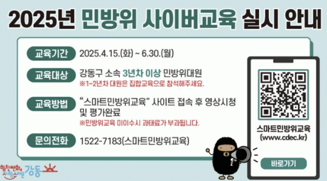 [NWS¹æ¼Û=Çѽ¸ñ ±âÀÚ]°­µ¿±¸´Â ¹Î¹æÀ§ Æí¼º ´ë¿ø 32,000¿© ¸íÀ» ´ë»óÀ¸·Î ÇÏ´Â 2025³â ¹Î¹æÀ§ ±³À°À» 3¿ù 31ÀϺÎÅÍ º»°ÝÀûÀ¸·Î ½ÃÀÛÇß´Ù°í ¹àÇû´Ù. ¹Î¹æÀ§ ±³À°Àº ÇØ´ç ¿¬Â÷º°·Î ÁýÇÕ±³À°°ú »çÀ̹ö(¿Â¶óÀÎ) ±³À°À¸·Î ³ª´©¾î ÁøÇàµÇ¸ç, ¡¦