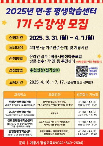 [NWS¹æ¼Û=Çѽ¸ñ ±âÀÚ]°è·æ½Ã´Â 2025³â ¸é¡¤µ¿ Æò»ýÇнÀ¼¾ÅÍ 1±â ÇÁ·Î±×·¥ ¼ö°­»ýÀ» 4¿ù 7ÀϱîÁö ¸ðÁýÇÑ´Ù°í ¹àÇû´Ù. À̹ø ÇÁ·Î±×·¥Àº ¸é¡¤µ¿ 4°³ Áö¿ª Æò»ýÇнÀ¼¾ÅÍ(ÁÖ¹ÎÀÚÄ¡¼¾ÅÍ) ¹× ½Ã °ü³» ½Ã¼³¿¡¼­ ÁֹΠ¸ÂÃãÇü °­Á¸¦ ¿î¿µÇÏ´Â »ç¡¦