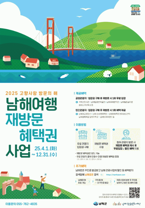 [NWS¹æ¼Û=Çѽ¸ñ ±âÀÚ]³²Çذü±¤¹®È­Àç´ÜÀÌ 2025 °íÇâ»ç¶û ¹æ¹®ÀÇ ÇØ¸¦ ¸Â¾Æ ³²ÇØ °ü±¤°´ À¯Ä¡¿Í Àç¹æ¹® À¯µµ¸¦ À§ÇÑ ¡®³²ÇØ¿©Çà Àç¹æ¹® »ç¾÷¡¯À» ÃßÁøÇÑ´Ù. Àç¹æ¹® »ç¾÷Àº ³²ÇØÀÇ ¾Æ¸§´Ù¿î °ü±¤Áö¸¦ µÑ·¯º¸°í, ÇÔ²² ÇÏ°í ½ÍÀº »ç¶÷°ú ´Ù¡¦