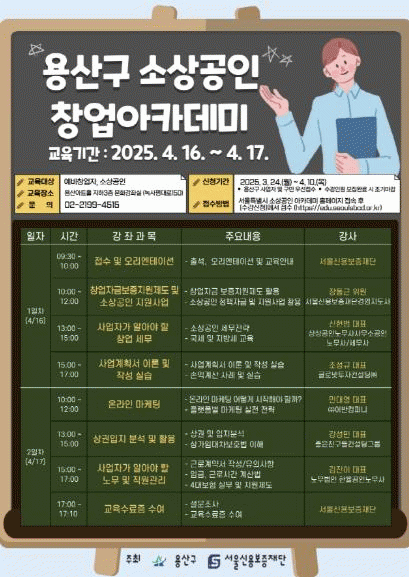 [NWS¹æ¼Û=Çѽ¸ñ ±âÀÚ]¼­¿ï ¿ë»ê±¸°¡ ¿¹ºñ â¾÷ÀÚ¿Í ¼Ò»ó°øÀÎÀÇ ¼º°øÀûÀΠâ¾÷À» Áö¿øÇϱâ À§ÇØ 'â¾÷¾ÆÄ«µ¥¹Ì'¸¦ °³ÃÖÇÑ´Ù. ÀÌ ÇÁ·Î±×·¥Àº â¾÷¿¡ ²À ÇÊ¿äÇÑ ±³À°À» Á¦°øÇØ Ã¢¾÷ °úÁ¤¿¡¼­ °ÞÀ» ¼ö ÀÖ´Â ¾î·Á¿òÀ» ÁÙÀ̰í, ¾ÈÁ¤ÀûÀÎ »ç¾÷ ¡¦