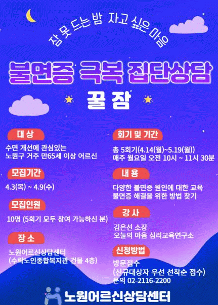 [»çȸ] ÀÚ°í ½ÍÀº ¸¶À½¾Æ, Àá ¸øµå´Â ¸öÀ» À̰ܶó! ³ë¿ø, ¾î¸£½Å»ó´ã¼¾ÅÍ ºÒ¸éÁõ ±Øº¹ Áý´Ü»ó´ã '²ÜÀá' ÁøÇà |2025. 04.01