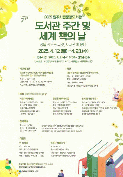 [NWS¹æ¼Û=Çѽ¸ñ ±âÀÚ]¿øÁֽø³Áß¾Óµµ¼­°üÀº µµ¼­°ü ÁÖ°£ ¹× ¼¼°è Ã¥ÀÇ ³¯À» ¸Â¾Æ ¿À´Â 4¿ù 12ÀϺÎÅÍ 23ÀϱîÁö ´Ù¾çÇÑ ¹®È­ Çà»ç¸¦ ¿î¿µÇÑ´Ù. ¡ã´ëÃ⠱Ǽö¸¦ È®´ëÇÏ´Â ¡®µÎ ¹è ´ëÃ⡯ ¡ã´ëÃâ Á¤Áö¸¦ ÇØÁ¦ÇÏ´Â ¡®¿¬Ã¼ÀÚ ÇØ¹æÀÇ ³¯¡¯ ¡ã¡®¡¦