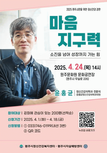[NWS¹æ¼Û=Çѽ¸ñ ±âÀÚ]¿øÁÖ½ÃÁ¤½Å°Ç°­º¹Áö¼¾ÅÍ´Â ¿À´Â 4¿ù 24ÀÏ ¿ÀÈÄ 2½Ã ¿øÁÖ¹®È­¿ø ¹®È­°ø¿¬Àå¿¡¼­ ¡®¸¶À½ Áö±¸·Â: ¼ÒÁøÀ» ³Ñ¾î ¼ºÀå±îÁö °¡´Â Èû¡¯À» ÁÖÁ¦·Î Á¤½Å°Ç°­ °­¿¬À» °³ÃÖÇÑ´Ù. À̹ø °­¿¬¿¡´Â 'ÀÚÁ¸°¨ ¼ö¾÷', '¸¶À½ Áö±¸·Â'ÀÇ¡¦