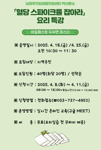 [NWS¹æ¼Û=Çѽ¸ñ ±âÀÚ]³²¿øÁְǰ­»ýȰÁö¿ø¼¾ÅÍ Çõ½ÅºÐ¼Ò´Â Áö¿ª ÁÖ¹ÎÀÇ ¸¸¼ºÁúȯ ¿¹¹æ ¹× °ü¸®¸¦ À§ÇØ ¡®Ç÷´ç ½ºÆÄÀÌÅ©¸¦ Àâ¾Æ¶ó¡¯ ¿ä¸® Ư°­ ÇÁ·Î±×·¥ Âü¿©ÀÚ¸¦ ¸ðÁýÇÑ´Ù. À̹ø ÇÁ·Î±×·¥Àº 4¿ù 18Àϰú 25ÀÏ ¾çÀϰ£ ¿µ¾ç±³À° ¹× ¿ä¸®½Ç½À¡¦
