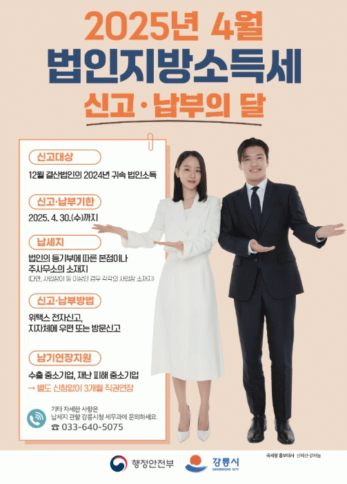 [»çȸ] °­¸ª½Ã ¡°4¿ù30ÀϱîÁö ¹ýÀÎÁö¹æ¼Òµæ¼¼ ½Å°í¡¤³³ºÎ Çϼ¼¿ä¡± |2025. 04.01