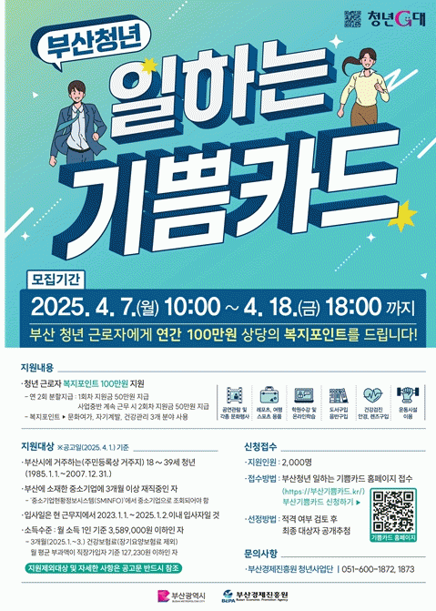 [NWS¹æ¼Û=ÇãÀº¼­ ±âÀÚ]ºÎ»ê½Ã´Â ¿À´Â 4¿ù 7ÀϺÎÅÍ 4¿ù 18ÀϱîÁö '2025³â ºÎ»ê û³â ÀÏÇÏ´Â ±â»ÝÄ«µå Áö¿ø »ç¾÷'¿¡ Âü¿©ÇÒ Ã»³âÀ» ¸ðÁýÇÑ´Ù°í ¹àÇû´Ù. ´ë±â¾÷°úÀÇ ÀÓ±Ý °ÝÂ÷¸¦ ÀÏºÎ ÇØ¼ÒÇØ Áß¼Ò±â¾÷¿¡ ±Ù¹«ÇÏ´Â ºÎ»ê û³âÀÇ ±Ù·ÎÀÇ¿åÀ»¡¦
