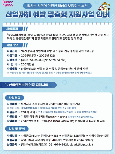 [NWS¹æ¼Û=Çѽ¸ñ ±âÀÚ]ºÎ»ê½Ã´Â 50ÀÎ ¹Ì¸¸ ¼Ò±Ô¸ð »ç¾÷ÀåÀÇ »ê¾÷ÀçÇØ ¿¹¹æ°ú »ê¾÷¾ÈÀü °­È­¸¦ À§ÇØ '»ê¾÷ÀçÇØ ¿¹¹æ ¸ÂÃãÇü Áö¿ø»ç¾÷'À» ÃßÁøÇÑ´Ù°í ¹àÇû´Ù. '»ê¾÷ÀçÇØ ¿¹¹æ ¸ÂÃãÇü Áö¿ø»ç¾÷'Àº 'Áß´ëÀçÇØÃ³¹ú¹ý' 50ÀÎ ¹Ì¸¸ »ç¾÷Àå È®´ë¡¦