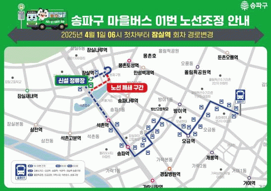 [NWS¹æ¼Û=Çѽ¸ñ ±âÀÚ]¼ÛÆÄ±¸´Â ±¸¹ÎµéÀÇ ±³ÅëÆíÀÇ ÁõÁøÀ» À§ÇØ ¿À´Â 4¿ù 1ÀÏ(È­) 06:00ºÎÅÍ ¸¶À»¹ö½º ¼ÛÆÄ 01¹ø ³ë¼±À» Á¶Á¤ÇÏ¿© ¿îÇàÀ» ½ÃÀÛÇÑ´Ù°í ¹àÇû´Ù. À̹ø¿¡ ³ë¼±Á¶Á¤ ³ë¼±Àº ¿À·û»ç°Å¸®~¿À±Ýµ¿~¼ÛÆÄ2µ¿~¼®ÃÌ¿ª~Àá½Ç¿ª?¼ÛÆÄ±¸Ã»¡¦