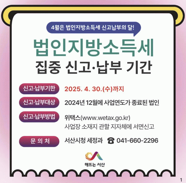 [»çȸ] ¼­»ê½Ã, 4¿ù ¹ýÀÎ Áö¹æ¼Òµæ¼¼ ÁýÁß½Å°í ±â°£ ¿î¿µ |2025. 04.01