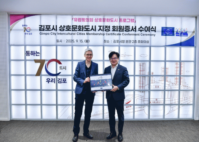 [NWS¹æ¼Û=Çѽ¸ñ ±âÀÚ]±èÆ÷½Ã´Â ¿À´Â 9¿ù 15ÀÏ(¿ù) ¿ÀÀü 10½Ã, ±èÆ÷½Ãû ÁßȸÀǽǿ¡¼­ ¡®À¯·´ÆòÀÇȸ »óÈ£¹®È­µµ½Ã ÇÁ·Î±×·¥(Council of Europe ICC Programme) ÁöÁ¤ ȸ¿øµµ½Ã Áõ¼­ ¼ö¿©½Ä¡¯À» °³ÃÖÇß´Ù. ¼ö¿©½Ä¿¡´Â À¯·´ÆòÀÇȸ ¸®Å¸ ¸¶¶ó¡¦