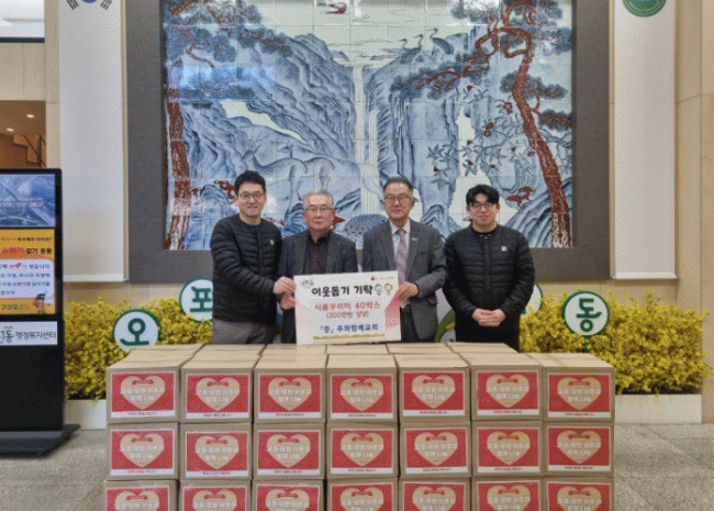 [NWS¹æ¼Û=Çѽ¸ñ ±âÀÚ]ÁÖ¿ÍÇÔ²²±³È¸´Â 20ÀÏ Áö¿ª ³» ¾î·Á¿î ÀÌ¿ôÀ» µ½±â À§ÇØ ½Äǰ ²Ù·¯¹Ì 40¹Ú½º(200¸¸ ¿ø »ó´ç)¸¦ ±¤Áֽà ¿ÀÆ÷1µ¿¿¡ ±âŹÇß´Ù. ÁÖ¿ÍÇÔ²²±³È¸´Â 2023³âºÎÅÍ ¸Å³â Ãß¼ö°¨»çÀýÀ» ¸Â¾Æ ½ÅµµµéÀÌ Á¤¼ºÀ» ¸ð¾Æ ÁغñÇÑ ½Ä·áǰ¡¦