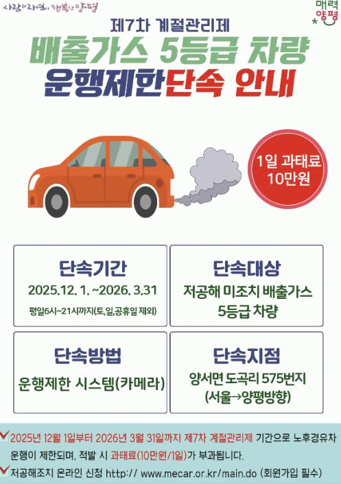 [NWS¹æ¼Û=Çѽ¸ñ ±âÀÚ]¾çÆò±º(Àº ¿À´Â 12¿ù 1ÀϺÎÅÍ 2026³â 3¿ù 31ÀϱîÁö Á¦7Â÷ ¹Ì¼¼¸ÕÁö °èÀý °ü¸®Á¦ ½ÃÇà¿¡ µû¶ó ¹èÃâ°¡½º 5µî±Þ Â÷·®¿¡ ´ëÇÑ ¿îÇà Á¦ÇÑ ´Ü¼ÓÀ» ½ÃÇàÇÑ´Ù°í ¹àÇû´Ù. À̹ø ¿îÇà Á¦ÇÑÀº °í³óµµ ¹Ì¼¼¸ÕÁö°¡ ºó¹øÈ÷ ¹ß»ýÇÏ¡¦