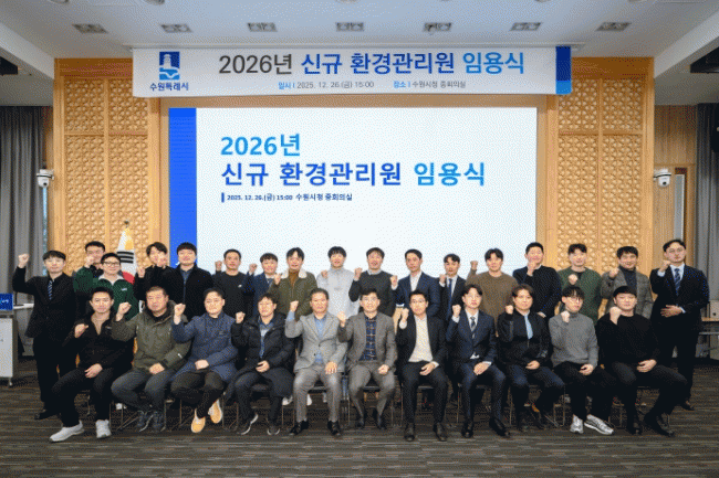 [NWS¹æ¼Û=Çѽ¸ñ ±âÀÚ] ¼ö¿øÆ¯·Ê½Ã°¡ 26ÀÏ ½Ãû ÁßȸÀǽǿ¡¼­ 2026³â ½Å±Ô ȯ°æ°ü¸®¿ø ÀÓ¿ë½ÄÀ» ¿­°í, ½Å±Ô ÀÓ¿ëÀÚ 21¸í¿¡°Ô ÀÓ¿ëÀåÀ» ¼ö¿©Çß´Ù. ¼ö¿ø½Ã´Â 2025³â ȯ°æ°ü¸®¿ø °ø°³ ä¿ë¿¡¼­ ÇÕ°ÝÀÚ 23¸íÀ» ¼±¹ßÇß°í, 2¸íÀº 7¿ù 1ÀÏ ÀڷΡ¦