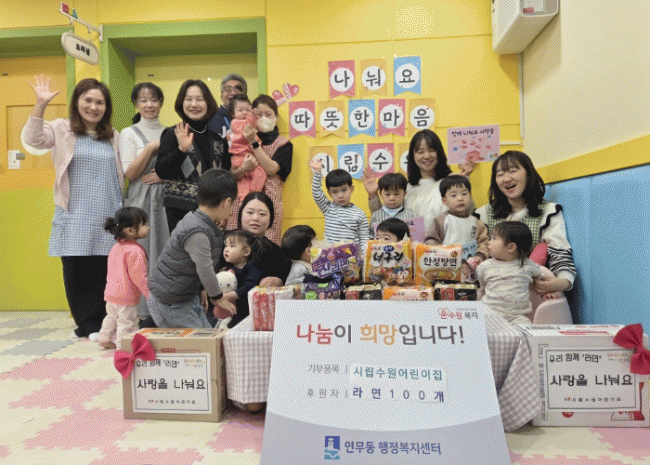 [NWS¹æ¼Û=Çѽ¸ñ ±âÀÚ]¼ö¿ø½Ã Àå¾È±¸ ¿¬¹«µ¿Àº Áö³­ 5ÀÏ, °ü³» ½Ã¸³¼ö¿ø¾î¸°ÀÌÁýÀ¸·ÎºÎÅÍ ¶ó¸é µî ÈÄ¿ø¹°Ç°À» Àü´Þ¹Þ¾Ò´Ù°í ¹àÇû´Ù. À̹ø ÈÄ¿øÀº Áö¿ª ³» ÀÌ¿ôµéÀ» µ½±â À§ÇØ ¾î¸°ÀÌÁý¿¡¼­ ÀÚ¹ßÀûÀ¸·Î ¸¶·ÃÇÑ °ÍÀ¸·Î, Àü´Þ¹ÞÀº ÈÄ¿ø¹°Ç°¡¦