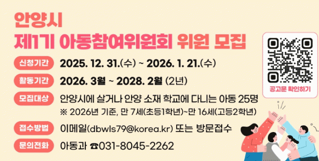 [»çȸ] ¾È¾ç½Ã, Á¦1±â ¾Æµ¿Âü¿©À§¿øÈ¸ À§¿ø °ø°³ ¸ðÁý¡¦¾Æµ¿±Ç¸® ½ÇÇö ù°ÉÀ½ |2026. 01.06