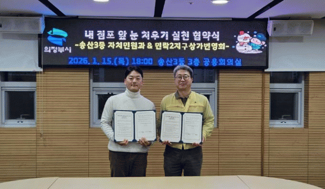 [»çȸ] ÀÇÁ¤ºÎ½Ã ¼Û»ê3µ¿, ¹Î¶ô2Áö±¸»ó°¡¹ø¿µÈ¸¿Í '³» Á¡Æ÷ ¾Õ ´« Ä¡¿ì±â' Çù¾à ¸Î¾î |2026. 01.16