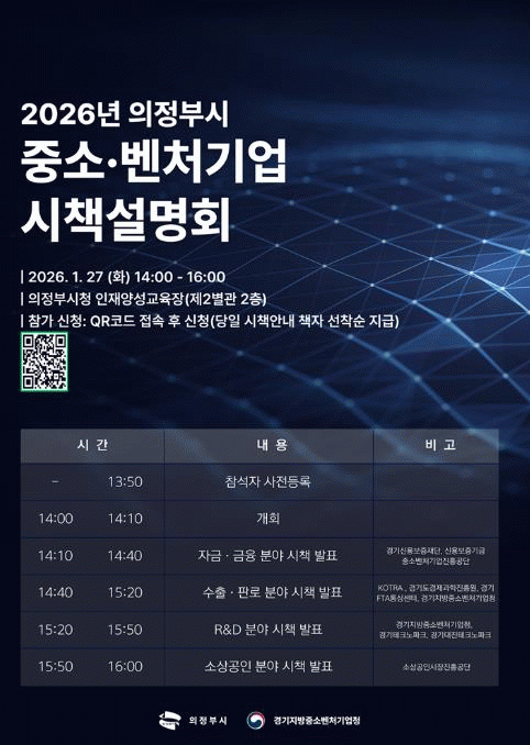 [»çȸ] ÀÇÁ¤ºÎ½Ã, 1¿ù 27ÀÏ ¡®2026³â Áß¼Ò?º¥Ã³±â¾÷ ½ÃÃ¥¼³¸íȸ¡¯ °³ÃÖ |2026. 01.16