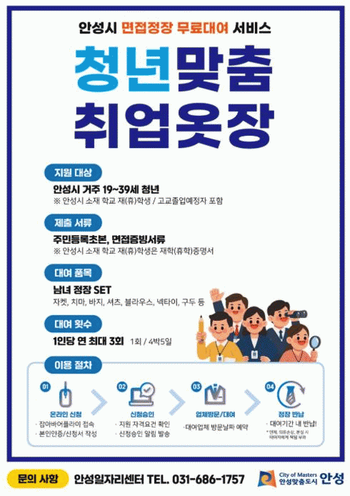 [NWS¹æ¼Û=Çѽ¸ñ ±âÀÚ]¾È¼º½Ã´Â û³â ±¸Á÷ÀÚÀÇ Ãë¾÷ Áغñ ºÎ´ãÀ» ´ú¾îÁÖ±â À§ÇØ ¡®Ã»³â¸ÂÃã Ãë¾÷¿ÊÀ塯 ¸éÁ¢Á¤Àå ´ë¿©»ç¾÷À» ½ÃÀÛÇÑ´Ù. ¸éÁ¢¿¡ ÇÊ¿äÇÑ Á¤À塤±¸µÎ¡¤³ØÅ¸ÀÌ µîÀ» 4¹Ú 5Àϰ£ ¹«·á ´ë¿©Çϸç, 1ÀÎ´ç ¿¬ 3ȸ±îÁö Áö¿øµÈ´Ù. ´ë¡¦