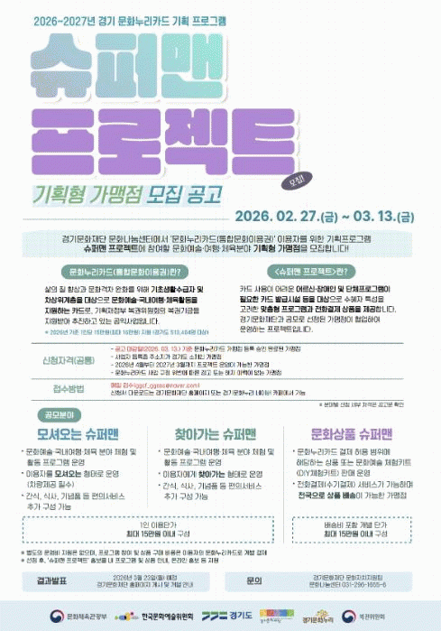 [»çȸ] °æ±â¹®È­Àç´Ü, 2026-2027³â ¹®È­´©¸®Ä«µå ±âȹ ÇÁ·Î±×·¥ '½´ÆÛ¸Ç ÇÁ·ÎÁ§Æ®' Âü¿© °¡¸ÍÁ¡ ¸ðÁý |2026. 03.03