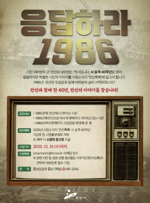 [NWS¹æ¼Û=Çѽ¸ñ ±âÀÚ]¾È»ê½Ã´Â ½Ã ½Â°Ý 40ÁÖ³âÀ» ¸Â´Â 2026³âÀ» ¾ÕµÎ°í ¾È»ê°ú ÇÔ²² ÇØ¿Â ½Ã¹ÎµéÀÇ »î ¡®½Ã¹Î À̾߱⡯ »ç¿¬À» ÀÌ´Þ 31ÀϱîÁö °ø°³ ¸ðÁýÇÑ´Ù°í 16ÀÏ ¹àÇû´Ù. À̹ø »ç¿¬ ¸ðÁýÀº ½Ã ½Â°Ý 40ÁÖ³âÀ» ±â³äÇØ ¡®½Ã¹ÎÀÌ °ð ¾È»ê¡¦