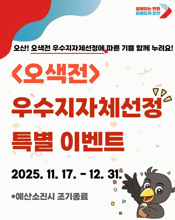 [»çȸ] ¿À»ê½Ã, ÇàÁ¤¾ÈÀüºÎ 'Áö¿ªÈ­Æó ¿î¿µ ¿ì¼öÁöÀÚü' ¼±Á¤... Ãß°¡ ±¹ºñ 6¾ï7500¸¸ ¿ø È®º¸ |2025. 11.12
