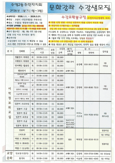 [NWS¹æ¼Û=Çѽ¸ñ ±âÀÚ]°í¾çƯ·Ê½Ã Àϻ꼭±¸ ÁÖ¿±2µ¿ ÁÖ¹ÎÀÚÄ¡¼¾ÅÍ´Â 12¿ù 15ÀϺÎÅÍ 19ÀϱîÁö 2026³â 1ºÐ±â ¹®È­°­Á ¼ö°­»ýÀ» ¸ðÁýÇÑ´Ù°í ¹àÇû´Ù. ¿ÃÇØ 1ºÐ±â(1¿ù~3¿ù)¿¡ ÃÑ 44°³ °­Á¸¦ ¿î¿µÇÒ ¿¹Á¤À¸·Î, À̹ø ºÐ±âºÎÅÍ´Â ¼ö°­»ýµéÀÇ ¡¦