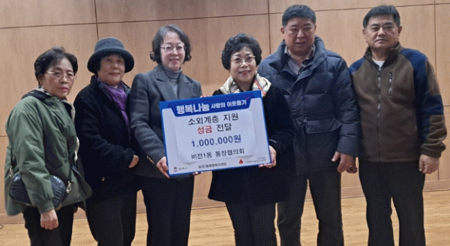 [NWS¹æ¼Û=Çѽ¸ñ ±âÀÚ]ÆòÅýà ºñÀü1µ¿ ÅëÀåÇùÀÇȸ´Â Áö³­ 17ÀÏ, ¿¬¸»À» ¸Â¾Æ °ü³» ¾î·Á¿î ÀÌ¿ôÀ» À§ÇØ ½á´Þ¶ó¸ç ÀÌ¿ôµ½±â ¼º±Ý 100¸¸ ¿øÀ» ºñÀü1µ¿ ÇàÁ¤º¹Áö¼¾ÅÍ¿¡ ±âºÎÇß´Ù. À̹ø ¼º±ÝÀº ÅëÀåÇùÀÇȸ°¡ Áö¿ª»çȸ ³ª´® ½ÇõÀ» À§ÇØ Àڹߡ¦