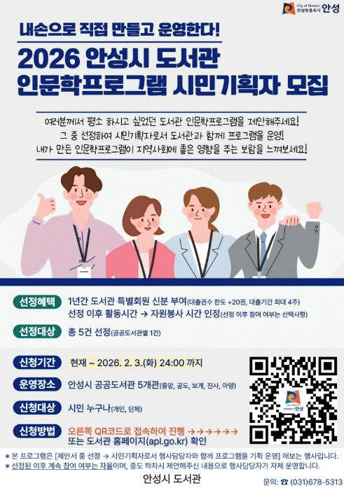 [NWS¹æ¼Û=Çѽ¸ñ ±âÀÚ]¾È¼º½Ã´Â ¡®2026³â ¾È¼º½Ã µµ¼­°ü ½Ã¹Î °øµ¿±âȹ Àι®ÇÐÇÁ·Î±×·¥¡¯À» ÃßÁøÇϸç, Àι®ÇÐ ÇÁ·Î±×·¥À» Á÷Á¢ ±âȹÇÏ°í ¿î¿µÇÒ ½Ã¹Î±âȹÀÚ¸¦ ¿À´Â 2¿ù 3ÀϱîÁö ¸ðÁýÇÑ´Ù°í ¹àÇû´Ù. À̹ø »ç¾÷Àº ½Ã¹ÎÀÌ ÁÖüÀûÀ¸·Î Âü¿©ÇØ¡¦