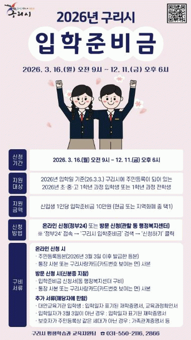 [NWS¹æ¼Û=Çѽ¸ñ ±âÀÚ]±¸¸®½Ã´Â ÇкθðÀÇ ±³À°ºñ ºÎ´ãÀ» ´ú°í ±³À°º¹Áö¸¦ ½ÇÇöÇϱâ À§ÇØ 3¿ù 16ÀϺÎÅÍ ¡®2026Çг⵵ ÃÊ¡¤Áß¡¤°íµîÇб³ ÀÔÇÐÁغñ±Ý Áö¿ø»ç¾÷¡¯ ½ÅûÀ» ¹Þ´Â´Ù. Áö¿ø ´ë»óÀº ÀÔÇÐÀÏ ±âÁØ ±¸¸®½Ã¿¡ Áֹεî·ÏÀÌ µÇ¾î ÀÖ´Â 20¡¦