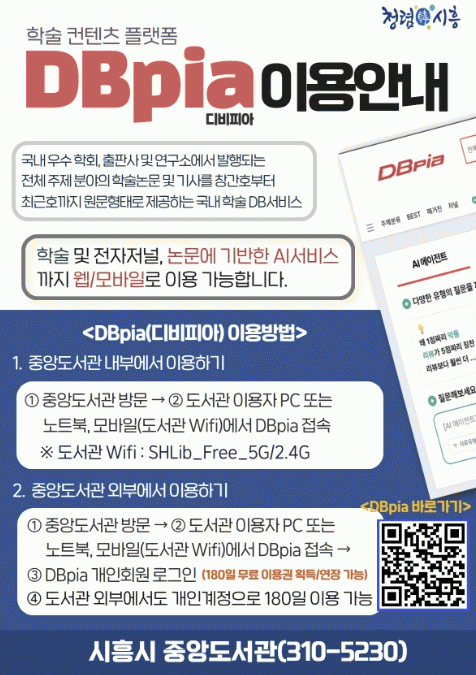 [NWS¹æ¼Û=Çѽ¸ñ ±âÀÚ]½ÃÈï½ÃÁß¾Óµµ¼­°üÀº ½Ã¹ÎµéÀÇ ¿¬±¸¡¤ÇнÀ Ȱµ¿À» Àû±Ø Áö¿øÇϰí Áö½ÄÁ¤º¸ Á¢±Ù¼ºÀ» ³ôÀ̱â À§ÇØ ±¹³» ´ëÇ¥ Çмú ÄÜÅÙÃ÷ Ç÷§ÆûÀÎ ¡®µðºñÇǾÆ(DBpia)¡¯ ÀÌ¿ë ¼­ºñ½º¸¦ Áö³­ 3¿ù 27ÀϺÎÅÍ ½ÃÀÛÇß´Ù. µðºñÇǾÆ(DBpia)¡¦