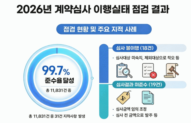 [NWS¹æ¼Û=Çѽ¸ñ ±âÀÚ]°æ±âµµ °¨»çÀ§¿øÈ¸´Â µµ º»Ã»°ú ½Ã±º, °ø°ø±â°ü µî 77°³ ±â°üÀ» ´ë»óÀ¸·Î ¡®°è¾à½É»ç ÀÌÇà½ÇÅ¡¯¸¦ Á¡°ËÇÑ °á°ú, 99.7%ÀÇ ³ôÀº ÀýÂ÷ ÁؼöÀ²À» ±â·ÏÇß´Ù°í 30ÀÏ ¹àÇû´Ù. °è¾à½É»ç´Â °ø°ø¹ßÁÖ »ç¾÷ÀÇ ¿¹Á¤°¡°Ý°ú ¼³°è¡¦