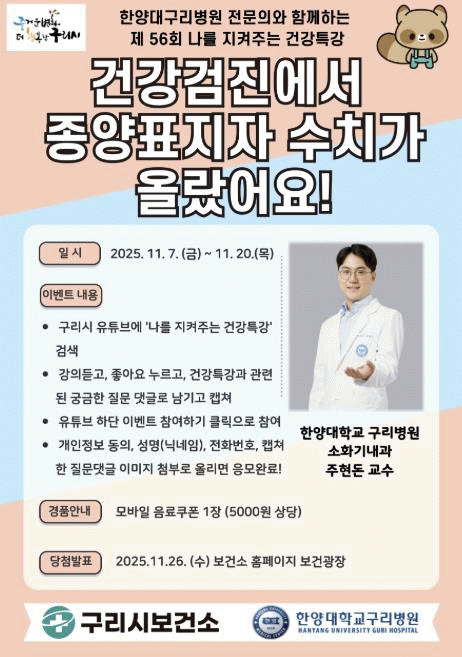 [NWS¹æ¼Û=Çѽ¸ñ ±âÀÚ]±¸¸®½Ã´Â ½Ã¹ÎÀÇ ¾Ï ¿¹¹æ°ú °Ç°­°ü¸® ¿ª·® °­È­¸¦ À§ÇØ, ¿À´Â 7ÀÏ ÇѾç´ëÇб³±¸¸®º´¿ø ¼ÒÈ­±â³»°ú ÁÖÇöµ· ±³¼ö¸¦ ÃÊÃ»ÇØ ¡®°Ç°­°ËÁø¿¡¼­ Á¾¾çÇ¥ÁöÀÚ ¼öÄ¡°¡ ¿Ã¶ú¾î¿ä!¡¯¸¦ ÁÖÁ¦·Î ÇÑ °Ç°­Æ¯°­À» ±¸¸®½Ã °ø½Ä À¯Æ©ºê¡¦