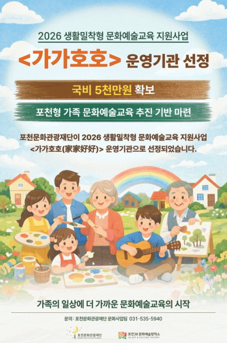 [NWS¹æ¼Û=Çѽ¸ñ ±âÀÚ]Æ÷õ¹®È­°ü±¤Àç´ÜÀÌ 2026 »ýȰ¹ÐÂøÇü ¹®È­¿¹¼ú±³À° Áö¿ø»ç¾÷ ¡®°¡°¡È£È£(ʫʫû¿û¿)¡¯ ¿î¿µ±â°ü °ø¸ð¿¡ ÃÖÁ¾ ¼±Á¤µÆ´Ù. Àç´ÜÀº Áö¿ªÀÇ »ýȰ ȯ°æ°ú °¡Á·ÀÇ »îÀÇ ¸Æ¶ôÀ» ¹Ý¿µÇÑ »ç¾÷ ÃßÁø ±â¹ÝÀ» ÀÎÁ¤¹Þ¾Æ ¿î¿µ±â°ü¿¡¡¦