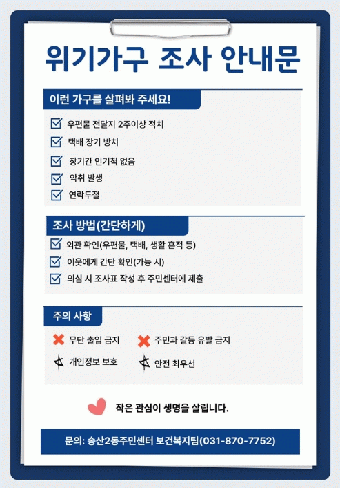 [NWS¹æ¼Û=Çѽ¸ñ ±âÀÚ]ÀÇÁ¤ºÎ½Ã ¼Û»ê2µ¿Áֹμ¾ÅÍ´Â 2026³â »ó¹Ý±â¸¦ ¸Â¾Æ Ãë¾à°èÃþ ÁýÁß °ÅÁÖÁö¿ªÀ» ´ë»óÀ¸·Î À§±â°¡±¸ ¹ß±¼?Áö¿ø Á¶»ç¸¦ º»°Ý ÃßÁøÇÑ´Ù. À̹ø Á¶»ç´Â 1ÀÎ °¡±¸ Áõ°¡¿Í »çȸÀû °í¸³ ½ÉÈ­·Î °íµ¶»ç À§ÇèÀÌ Áõ°¡ÇÔ¿¡ µû¶ó ¡¦