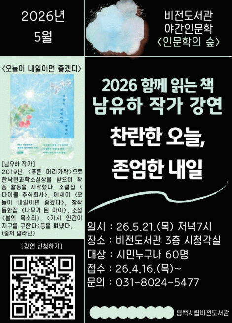 [NWS¹æ¼Û=Çѽ¸ñ ±âÀÚ]ÆòÅýø³ ºñÀüµµ¼­°üÀº ¿À´Â 5¿ù 21ÀÏ Àú³á 7½Ã ³²À¯ÇÏ ÀÛ°¡¸¦ ÃÊûÇÏ¿© ¡®Âù¶õÇÑ ¿À´Ã, Á¸¾öÇÑ ³»ÀÏ¡¯À» ÁÖÁ¦·Î ¾ß°£ Àι®ÇÐ °­¿¬À» ÁøÇàÇÑ´Ù. À̹ø °­¿¬ÀÇ ÁÖÁ¦ µµ¼­´Â 2026³â ÆòÅýà ÇÔ²² Àд åÀ¸·Î ±ä Åõº´¡¦